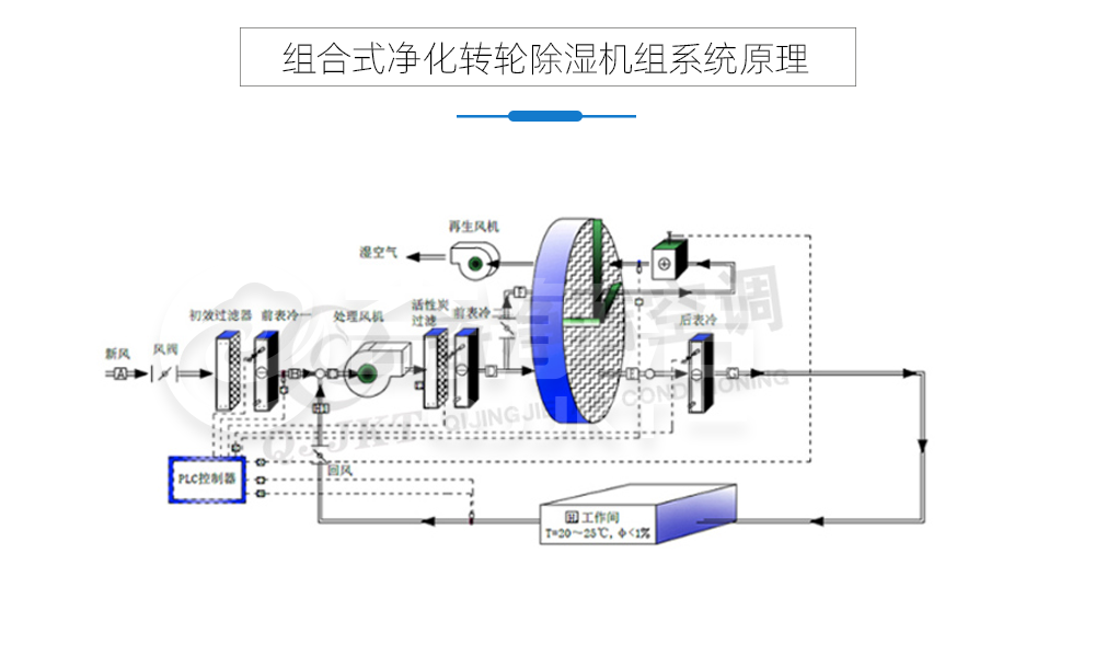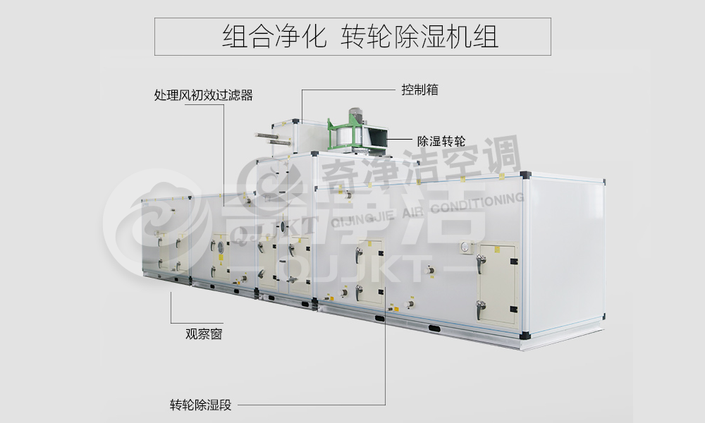 由转轮除湿段(包括干燥转轮、再生风机、再生加热器、再生过滤器和再生风阀)处理风机段、前表冷段、后表冷段、处理风初效过滤器(可选中、高效过滤器)、控制箱等组成